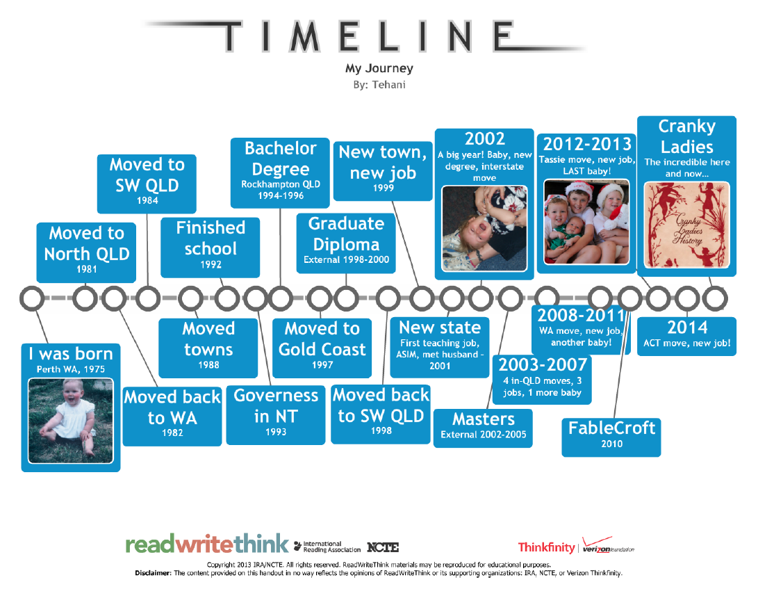 I wanted to show you this for some context of what I’m going to say next, but I need to note that the space I had to make it was limited, so it only shows the major moves and events – I went to nine different schools, and three universities, moved house more times than I can count as a child and a student, and we worked out that since we met, my husband and I have moved 12 times (not ALWAYS interstate…), which averages out at once per year… No wonder I’m tired!