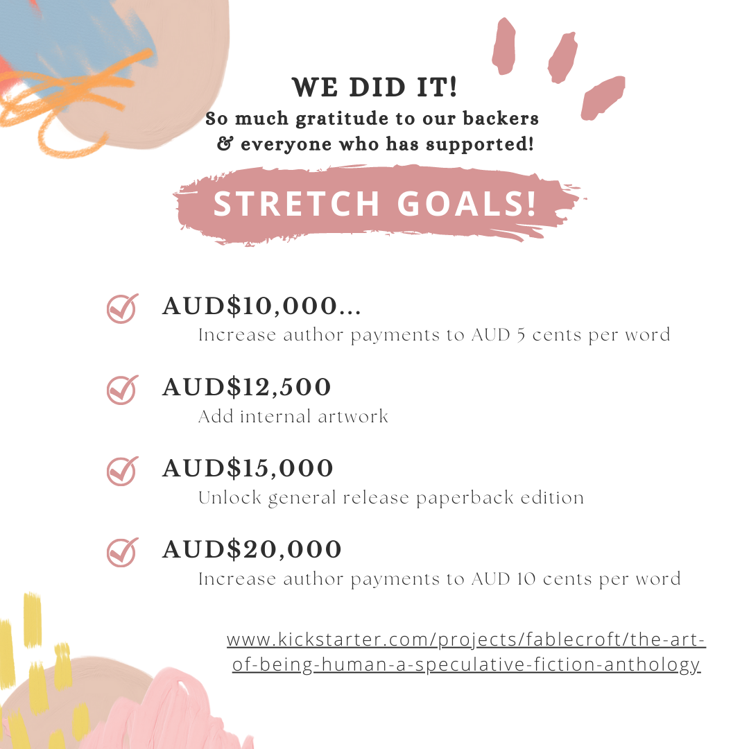 But we’ve still got a dream! In order to pay pro rates of six cents per word for the original stories in the anthology, we estimate we need to reach a goal of $4,500 – and we’ve still got ten days to try for it! We’re happy to aim for the stars even if we don’t quite make it though, because even if we only get to $2,500, we can increase the per word payment, which would be fabulous.